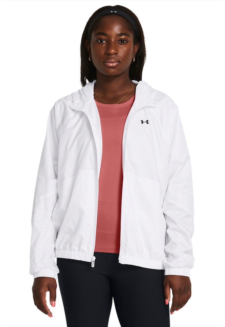 Общи характеристики Тип продукт: яке Стил: с качулка Спорт: фитнес Цвят: бял – черен Принт: без принт – лого Кройка: стандартна Материал: синтетичен Закопчаване: цип Технология материал: дишаща материя – storm – непромокаемост Детайли материал Външна част: 100% полиестер
