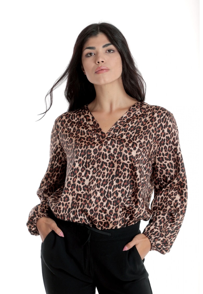 888144258-Дамска блуза с V-образно деколте – леопардов сатен – кафява Eranthe