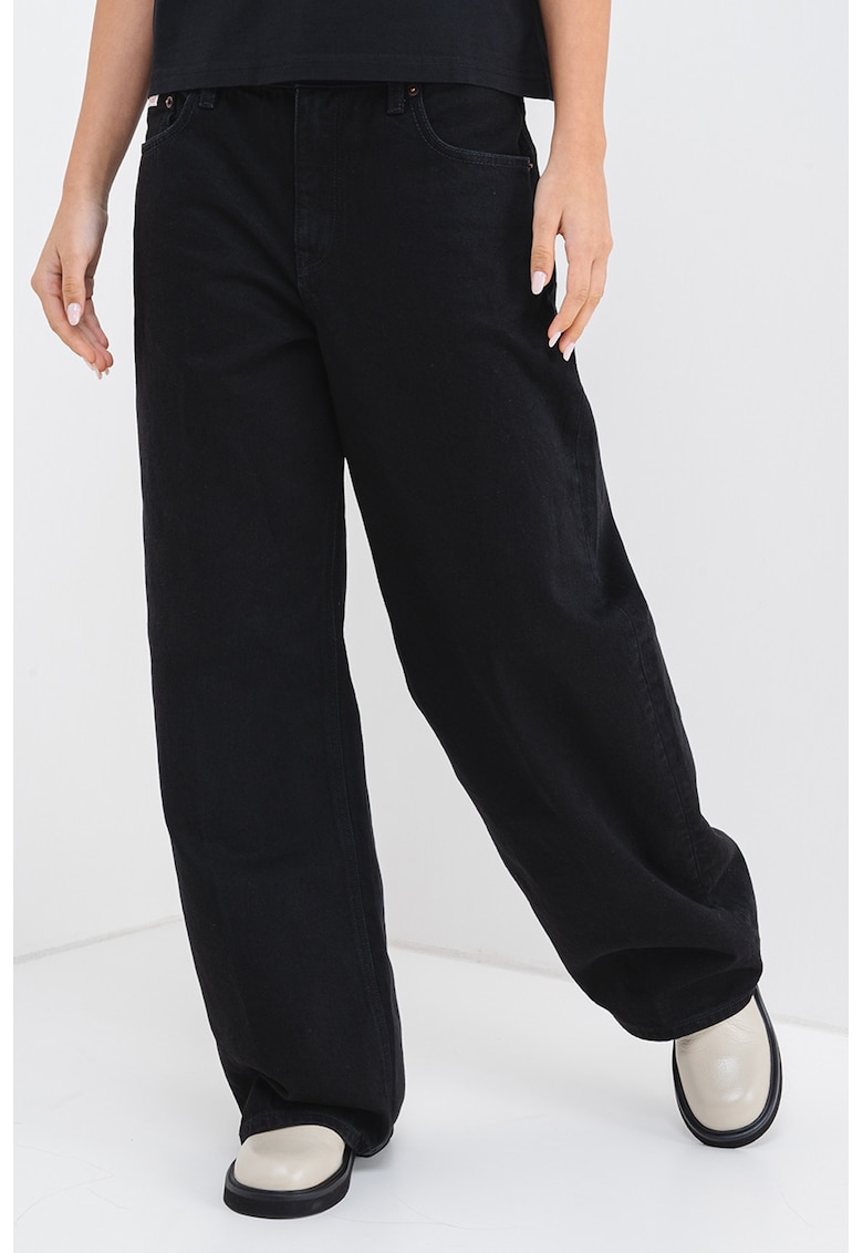Характеристики Цвят: черен Принт: без принт Кройка: широк крачол Материал: дънков плат Талия: висока Дължина: дълъг Джобове: 5 броя Закопчаване: цип – копчета Състав Външна част: 80% памук – 20% рециклирани памук Информация за модел Моделът е облечен с размер W27-L30. Размер на …
