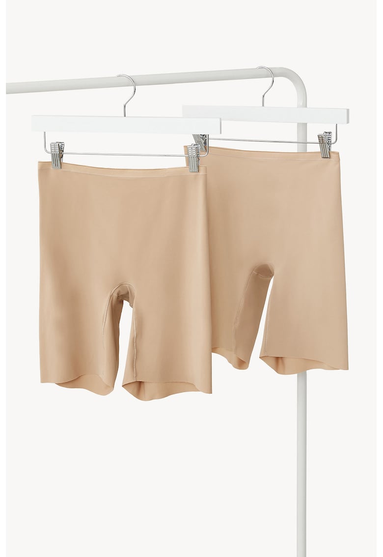Характеристики Тип продукт: комплект боксерки Цвят: бежов Принт: без принт Материал: синтетичен Брой/комплект: 2 Талия: висока Детайли: оформящ ефект Състав Външна част: 77% полиамид – 23% еластан