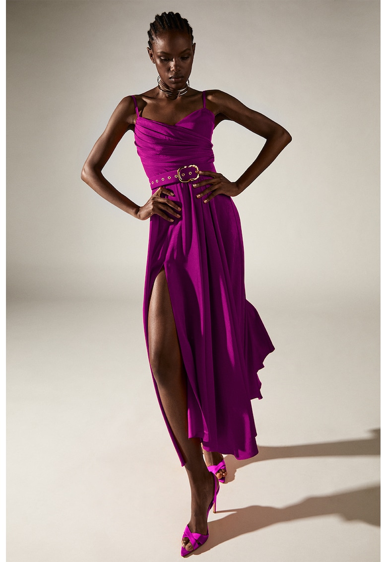 Характеристики Цвят: фанданго розово Стил: елегантен Материал: полиестер – синтетичен – устойчиво Принт: без принт Кройка: разкроена Дължина: средна Деколте: застъпено Презрамки: регулируеми Дължина ръкав: без ръкав Детайли: цепка отпред – колан Закопчаване: цип Състав …